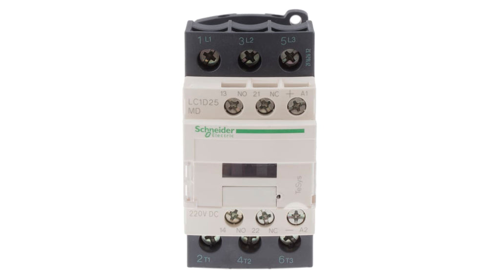 Contattore Schneider Electric, serie LC1D, 3 poli, 3 NA, 25 A, bobina 230 V cc. Tensione nominale contatto 690 V c.a./c.c., corrente nominale 25 A, configurazione contatti ausiliari 1 NO + 1 NC, numero di contatti ausiliari 2, tipo terminale vite, dimensioni 45 mm x 85 mm x 101 mm. Categoria di utilizzo AC-1, AC-3, AC-4. Accessori disponibili per montaggio frontale.