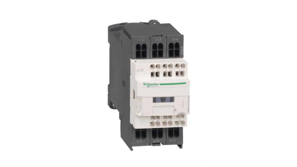 Contattore di commutazione Schneider Electric, serie LC1D, 3 poli, 1 NA + 1 NC, 38 A, bobina 230 V. Velocità di funzionamento fino a 3600 cicli all'ora, temperatura ambiente fino a 60 gradi Celsius. Montaggio su guida DIN o fissaggio a vite, morsetti ad anello con viti multi-standard, resistenza al fuoco, ausiliari a prova di polvere.
