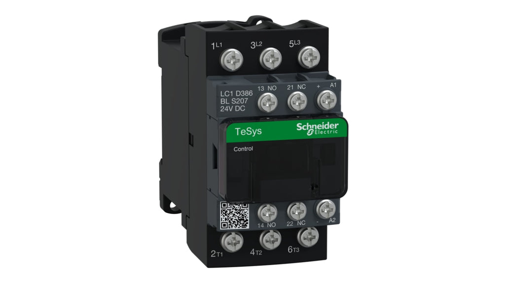 Contattore Schneider Electric, serie TeSys, 3 poli, 3NO, 50 A, bobina 24 V. Tensione bobina 24 V, corrente nominale contatto 50 A, tensione nominale contatto 440 V. Terminali ad anello a levetta, conforme a RoHS, senza PVC e mercurio, prodotto verde Premium. Coperchio protettivo incluso. Compatibile con contatti M5.
