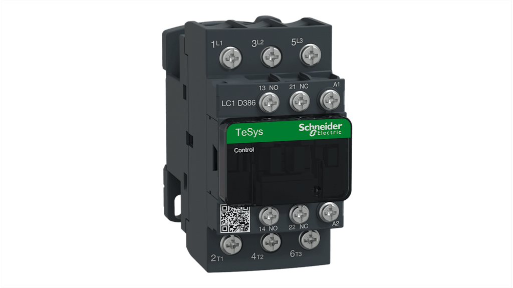 Contattore di commutazione Schneider Electric, serie LC1D, 3 poli, 1 NA + 1 NC, corrente nominale 38 A, bobina a basso consumo, controllo elettronico, velocità di funzionamento fino a 3600 cicli all'ora, temperatura ambiente fino a 60 gradi Celsius, montaggio su guida DIN o fissaggio a vite, morsetti ad anello con viti multi-standard, resistenza al fuoco, ausiliari a prova di polvere.