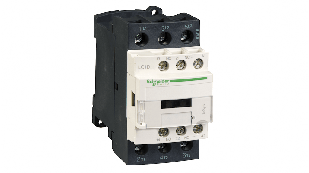 Contattore di commutazione Schneider Electric, serie LC1D, 3 poli, 1 NA + 1 NC, corrente nominale 38 A, bobina a basso consumo, controllo elettronico, velocità di funzionamento fino a 3600 cicli all'ora, temperatura ambiente fino a 60 gradi, montaggio su guida DIN o fissaggio a vite, morsetti ad anello con viti multi-standard, resistenza al fuoco, ausiliari a prova di polvere.