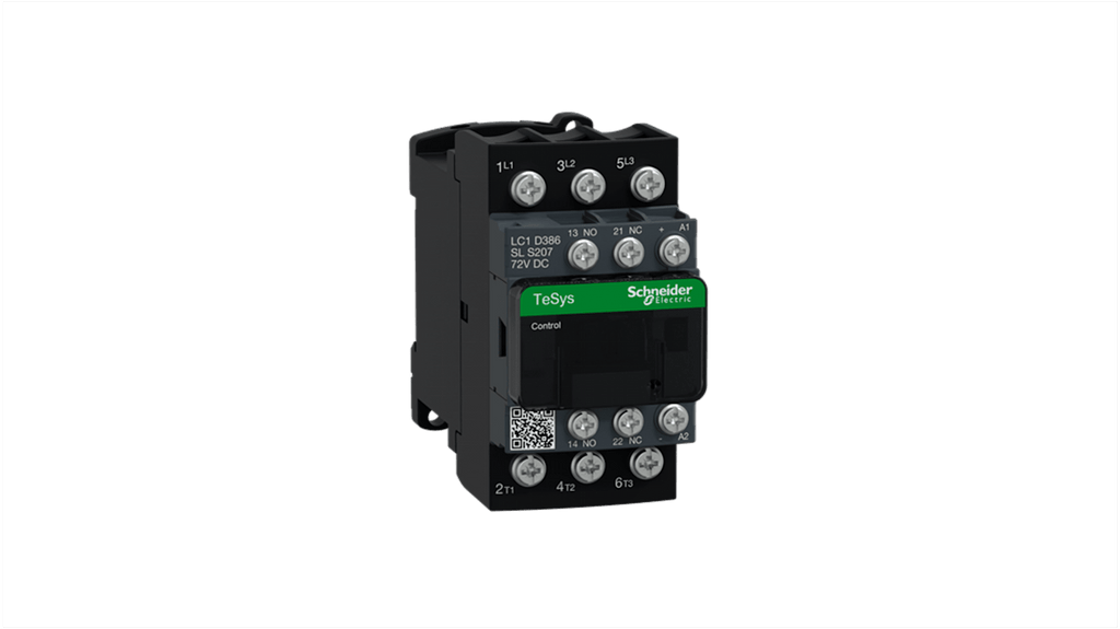 Contattore 3NO, 38 A, Schneider Electric. Tensione operativa nominale fino a 690 V CA, corrente termica convenzionale 50 A, potenza nominale 9 kW, configurazione polo 3, tensione di controllo 72 V c.c., dispositivo di soppressione integrato, contatti ausiliari collegati meccanicamente, conforme a standard di sicurezza. Applicazioni per carico resistivo e controllo motore. Serie LC1D, range TeSys Deca.