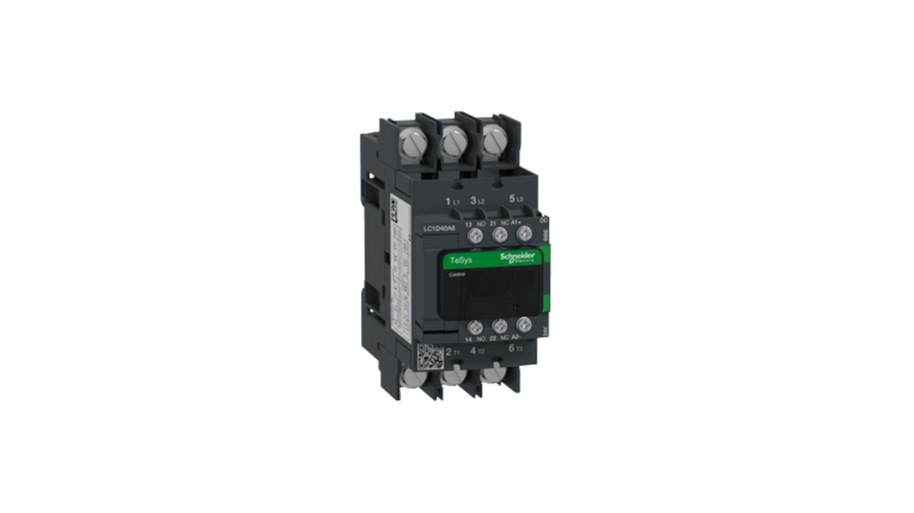 Contattore di commutazione Schneider Electric, serie LC1D, 3 poli, 1 NA + 1 NC, corrente nominale 40 A, bobina a basso consumo, controllo elettronico, velocità di funzionamento fino a 600 cicli all'ora, temperatura ambiente fino a 60 gradi, montaggio su guida DIN o fissaggio a vite, dimensioni ottimizzate, resistenza al fuoco, morsetti ad anello, ampia gamma di accessori disponibili.