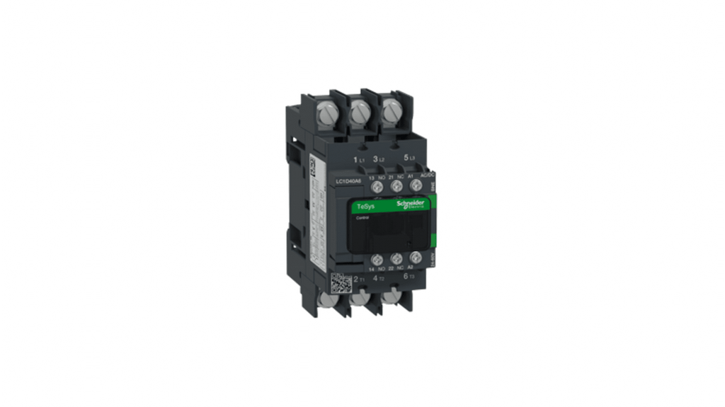 Contattore di commutazione Schneider Electric, serie LC1D, 3 poli, 1 NA + 1 NC, corrente nominale 40 A, tensione bobina 24-60 V, velocità di funzionamento fino a 600 cicli all'ora, temperatura ambiente fino a 60 gradi, montaggio su guida DIN o fissaggio a vite, morsetti ad anello, resistenza al fuoco, accessori antipolvere, compatto per ottimizzazione spazio. Codice costruttore LC1D40A6BNE.