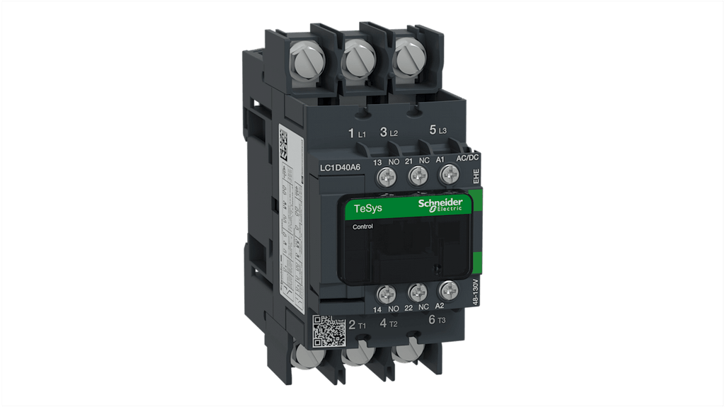 Contattore di commutazione Schneider Electric, serie LC1D, 3 poli, 1 NA + 1 NC, corrente nominale 40 A, bobina a basso consumo, controllo elettronico, velocità di funzionamento fino a 600 cicli all'ora, temperatura ambiente fino a 60 gradi, montaggio su guida DIN o fissaggio a vite, dimensioni ottimizzate, resistenza al fuoco, morsetti ad anello, compatibile con ampia gamma di accessori.