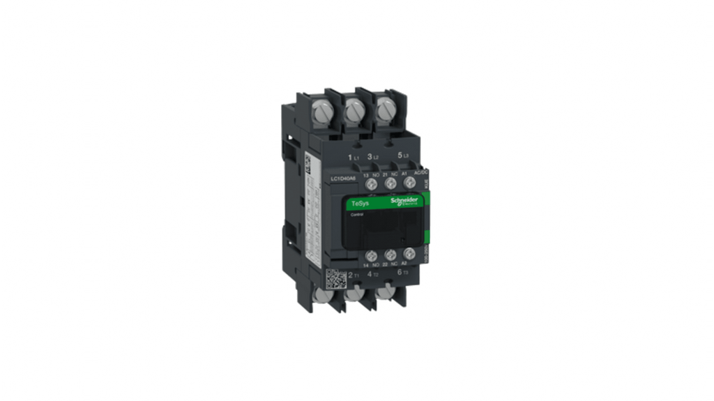 Contattore di commutazione Schneider Electric, serie LC1D, 3 poli, 1 NA + 1 NC, corrente nominale 40 A, tensione bobina 100 a 250 V, velocità di funzionamento fino a 600 cicli all'ora, temperatura ambiente fino a 60 °C, montaggio su guida DIN o fissaggio a vite, compatto, morsetti ad anello, resistenza al fuoco, accessori antipolvere. Codice costruttore LC1D40A6KUE.