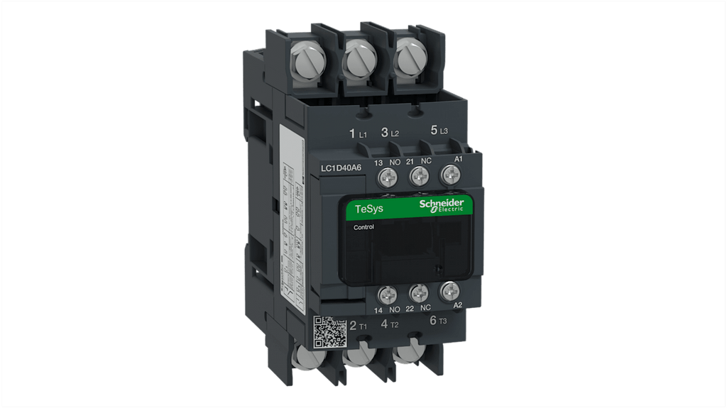 Contattore di commutazione Schneider Electric, serie LC1D, 3 poli, 1 NA + 1 NC, corrente nominale 40 A, bobina a basso consumo, controllo elettronico, velocità di funzionamento fino a 3600 cicli all'ora, temperatura ambiente fino a 60 gradi, montaggio su guida DIN o fissaggio a vite, morsetti ad anello con viti multi-standard, resistenza al fuoco, ausiliari a prova di polvere.