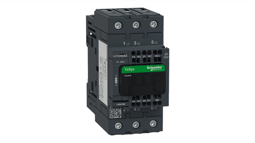 Contattore di commutazione Schneider Electric, serie LC1D, 3 poli, 1 NA + 1 NC, corrente nominale 50 A, tensione bobina 23 V, velocità di funzionamento fino a 3600 cicli all'ora, temperatura ambiente fino a 60 gradi, montaggio su guida DIN o fissaggio a vite, morsetti ad anello con viti multi-standard, resistenza al fuoco, ausiliari a prova di polvere.