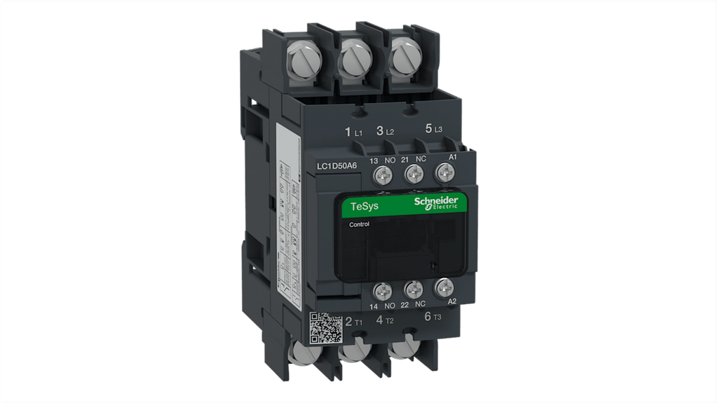 Contattore di commutazione Schneider Electric, serie LC1D, 3 poli, 1 NA + 1 NC, corrente nominale 50 A, bobina a basso consumo, controllo elettronico, velocità di funzionamento fino a 3600 cicli all'ora, temperatura ambiente fino a 60 gradi, montaggio su guida DIN o fissaggio a vite, morsetti ad anello con viti multi-standard, resistenza al fuoco, ausiliari a prova di polvere.