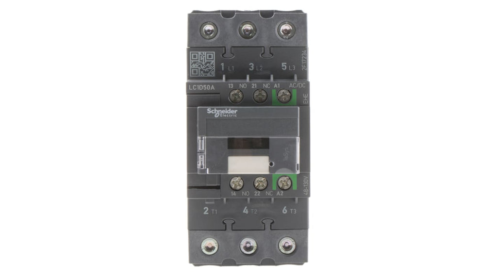 Contattore Schneider Electric, serie LC1D, 3 poli, 3 NO, 50 A, 22 kW, bobina 110 V c.a./c.c., tensione nominale contatto 690 V c.a., montaggio su guida DIN, terminali a vite, dimensioni 55 mm x 120 mm x 122 mm, temperatura operativa da -25°C a +60°C, grado di protezione IP20, accessori disponibili, doppia interruzione dei poli, progettato per carichi resistivi e controllo motori.
