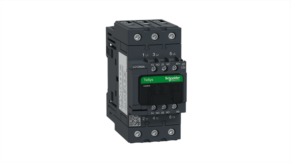 Contattore Schneider Electric, serie LC1D, 3 poli, 3 NA, 50 A, bobina 12 V cc. Tensione nominale contatto 690 V c.a./c.c., corrente nominale 50 A, configurazione contatti ausiliari 1 NO + 1 NC, numero di contatti ausiliari 2, tipo terminale vite. Dimensioni: larghezza 55 mm, lunghezza 122 mm, profondità 120 mm. Accessori disponibili: blocchi di contatto ausiliari, soppressori di sovratensioni, moduli di interfaccia.