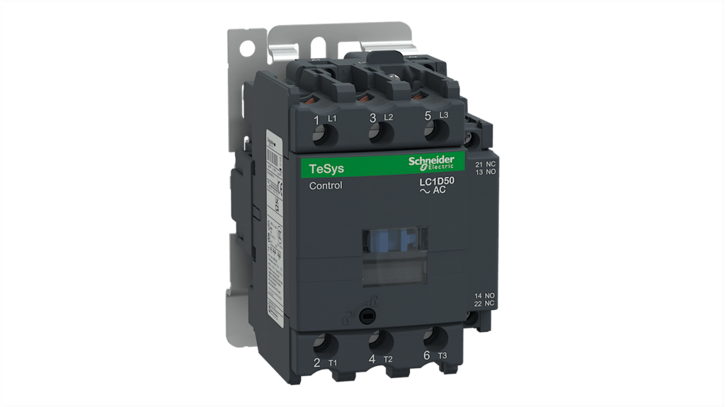 Contattore di commutazione Schneider Electric, serie LC1D, 3 poli, 1 NA + 1 NC, corrente nominale 50 A, tensione bobina 230 V, progettato per il controllo del motore. Velocità di funzionamento fino a 3600 cicli all'ora, temperatura ambiente fino a 60 gradi, montaggio su guida DIN o fissaggio a vite, bobina a basso consumo, resistenza al fuoco migliorata, dispositivi ausiliari antipolvere.