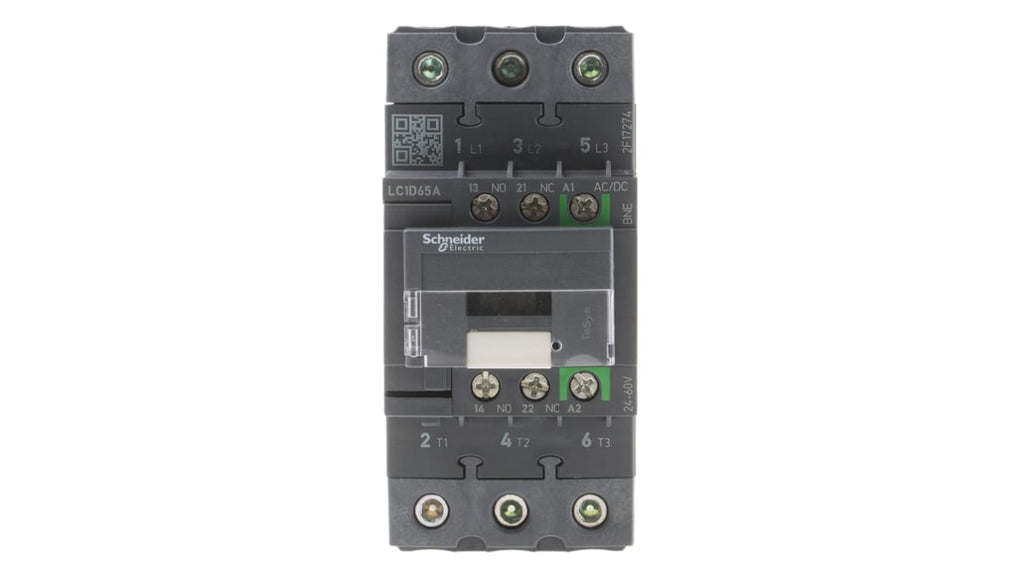 Contattore Schneider Electric, serie LC1D, 3 poli, 3 NO, 65 A, 30 kW, bobina 24 V ca/cc. Tensione nominale contatto 690 V c.a., montaggio su guida DIN, terminali a vite, dimensioni 55 mm x 120 mm x 122 mm, temperatura operativa da -25°C a +60°C, 2 contatti ausiliari, grado di protezione IP20. Progettato per applicazioni di controllo motori e carichi resistivi.