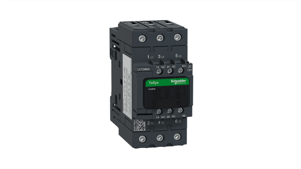 Contattore di commutazione Schneider Electric, serie LC1D, 3 poli, 1 NA + 1 NC, corrente nominale 65 A, tensione bobina 12 V. Funzionamento fino a 3600 cicli all'ora, temperatura ambiente fino a 60 gradi, montaggio su guida DIN o fissaggio a vite. Morsetti ad anello per installazione facilitata, resistenza al fuoco e ausiliari a prova di polvere.