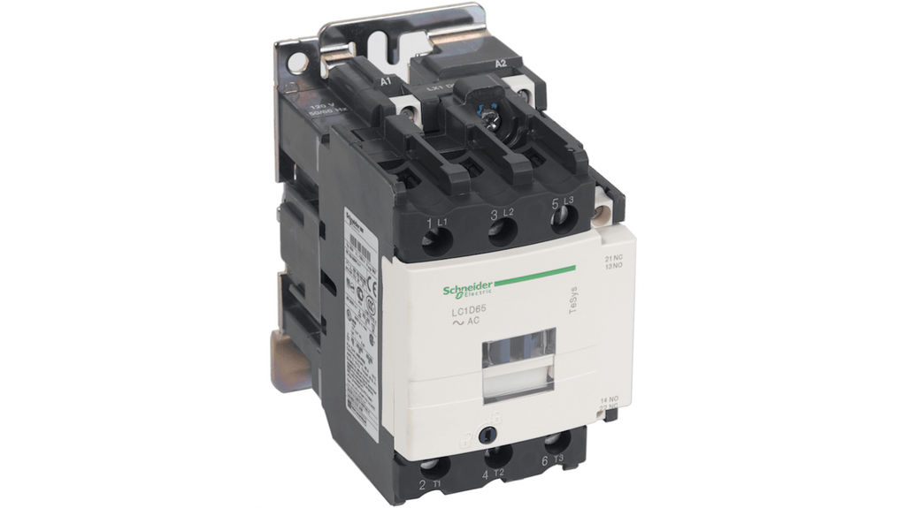 Contattore di commutazione Schneider Electric, serie LC1D, 3 poli, 1 NA + 1 NC, 65 A. Bobina a basso consumo, controllo elettronico, velocità di funzionamento fino a 3600 cicli all'ora, temperatura ambiente fino a 60 gradi Celsius. Morsetti ad anello con viti multi-standard, montaggio su guida DIN o fissaggio a vite, resistenza al fuoco, ausiliari a prova di polvere.