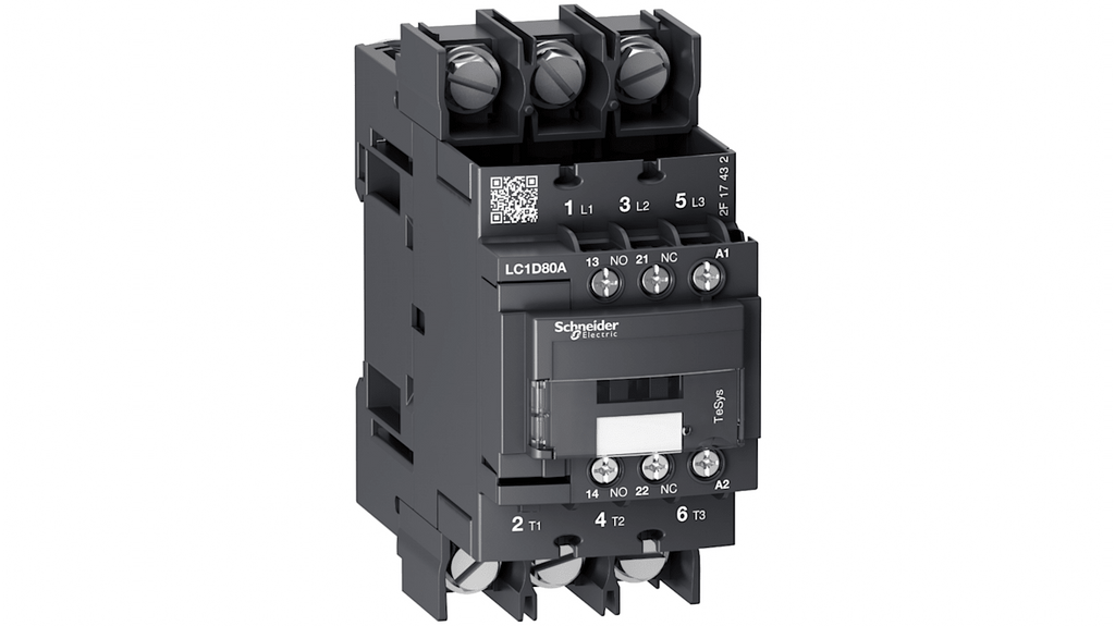 Contattore di commutazione Schneider Electric, serie LC1D, 3 poli, 1 NA + 1 NC, corrente nominale 80 A, tensione bobina 230 V, velocità di funzionamento fino a 3600 cicli all'ora, temperatura ambiente fino a 60 °C, montaggio su guida DIN o fissaggio a vite, bobina a basso consumo, resistenza al fuoco migliorata, dispositivi ausiliari antipolvere.