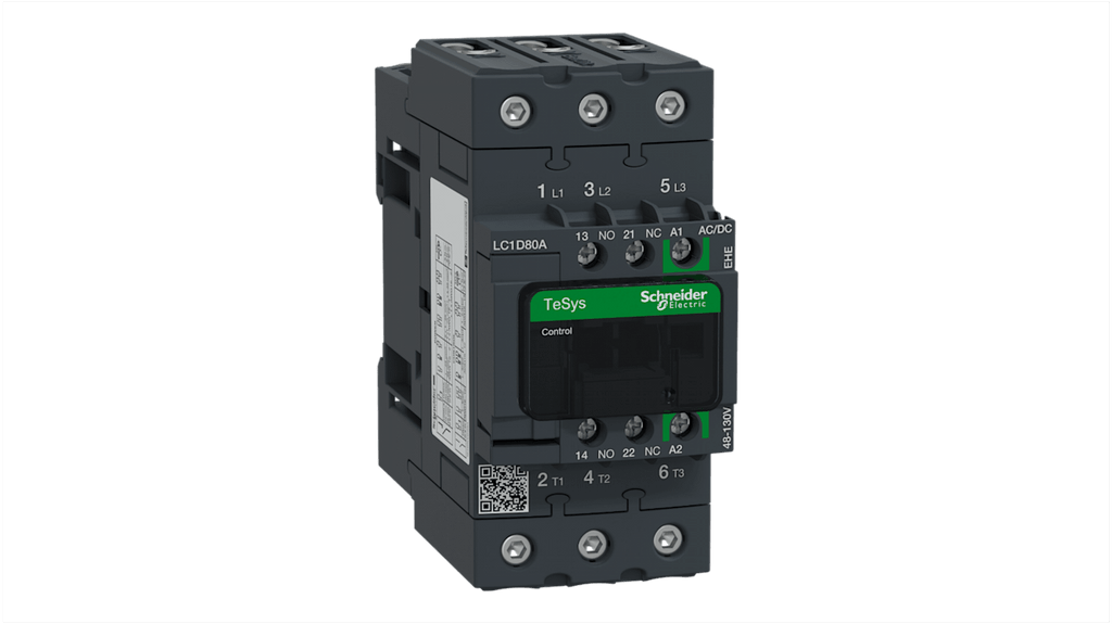 Contattore di commutazione Schneider Electric, serie LC1D, 3 poli, 1 NA + 1 NC, 80 A. Bobina a basso consumo, controllo elettronico, velocità di funzionamento fino a 3600 cicli all'ora, temperatura ambiente fino a 60 gradi Celsius. Morsetti ad anello con viti multi-standard, montaggio su guida DIN o fissaggio a vite, resistenza al fuoco, ausiliari a prova di polvere.
