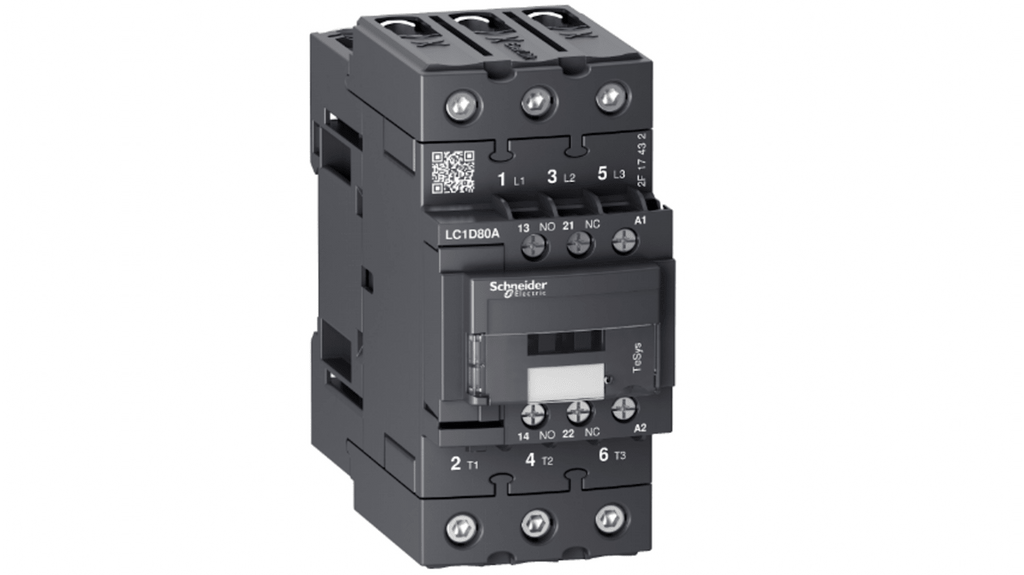 Contattore Schneider Electric per controllo motori, 3 poli, 3 contatti normalmente aperti, corrente nominale 66 A, potenza nominale 37 kW, tensione bobina 230 V, configurazione stato normale 3 NA, applicazioni fino a 440 V c.a., bobina 60 Hz. Corrente di commutazione minima 5 A, tensione di commutazione minima 17 V per circuito di segnalazione. Codice costruttore LC1D80AP7.