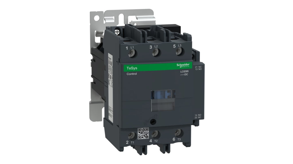 Contattore per controllo motori, 3 poli, 3 normalmente aperti, corrente nominale 95 A, potenza nominale 45 kW, tensione bobina 24 V c.c., montaggio su guida DIN o piastra, grado di protezione IP20, temperatura operativa da -5 a +60 gradi, dimensioni 127 mm x 85 mm x 181 mm, contatti ausiliari 1NO + 1NC, progettato per applicazioni industriali. Codice costruttore LC1D95BD, marchio Schneider Electric.