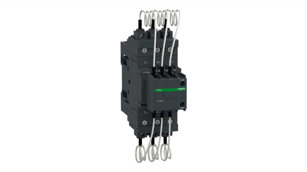 Contattore di commutazione Schneider Electric, serie LC1D, 3 poli, 1 NA + 1 NC, bobina 400 V. Tensione bobina 400 V, numero di poli 3, configurazione stato normale 1 NA + 1 NC, velocità di funzionamento fino a 3600 cicli all'ora, temperatura ambiente fino a 60 °C, montaggio su guida DIN o fissaggio a vite, resistenza al fuoco migliorata, dispositivi ausiliari antipolvere.