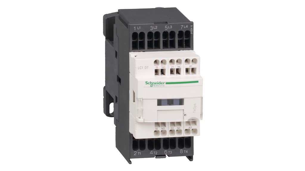Contattore di commutazione Schneider Electric, serie LC1D, 4 poli, 1 NA + 1 NC, corrente nominale 25 A, tensione bobina 24 V, velocità di funzionamento fino a 3600 cicli all'ora, temperatura ambiente fino a 60 gradi Celsius, montaggio su guida DIN o fissaggio a vite, morsetti ad anello con viti multi-standard, resistenza al fuoco, ausiliari a prova di polvere.