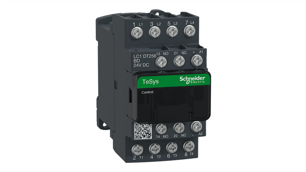 Contattore di commutazione Schneider Electric, serie LC1D, 4 poli, 1 NA + 1 NC, corrente nominale 25 A, tensione bobina 24 V, velocità di funzionamento fino a 3600 cicli all'ora, temperatura ambiente fino a 60 gradi, montaggio su guida DIN o fissaggio a vite, morsetti ad anello con viti multi-standard, resistenza al fuoco, ausiliari a prova di polvere.