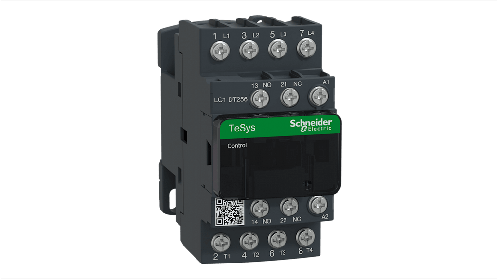 Contattore di commutazione Schneider Electric, serie LC1D, 4 poli, 1 NA + 1 NC, corrente nominale 25 A, tensione bobina 24 V, velocità di funzionamento fino a 3600 cicli all'ora, temperatura ambiente fino a 60 gradi, montaggio su guida DIN o fissaggio a vite, morsetti ad anello con viti multi-standard, resistenza al fuoco, ausiliari a prova di polvere.