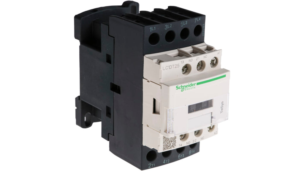 Contattore Schneider Electric, serie LC1D, 4 poli, 4NO, 25 A, bobina 230 V c.a. Tensione nominale contatto 690 V c.a., corrente nominale contatto 25 A, configurazione contatti ausiliari 1NO + 1NC, montaggio su piastra o guida DIN, dimensioni 45 mm x 85 mm x 90 mm, temperatura operativa da -5°C a +60°C, grado di protezione IP20, conforme a standard CSA, UL, IEC. Codice costruttore LC1DT25P7.