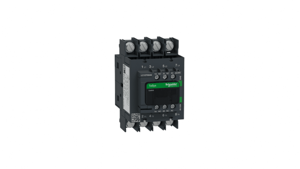 Contattore di commutazione Schneider Electric, serie LC1D, 4 poli, 1 NA + 1 NC, corrente nominale 80 A, tensione bobina 48-130 V, velocità di funzionamento fino a 3600 cicli all'ora, temperatura ambiente fino a 60 gradi, montaggio su guida DIN o fissaggio a vite, morsetti ad anello con viti multi-standard, resistenza al fuoco, ausiliari a prova di polvere.