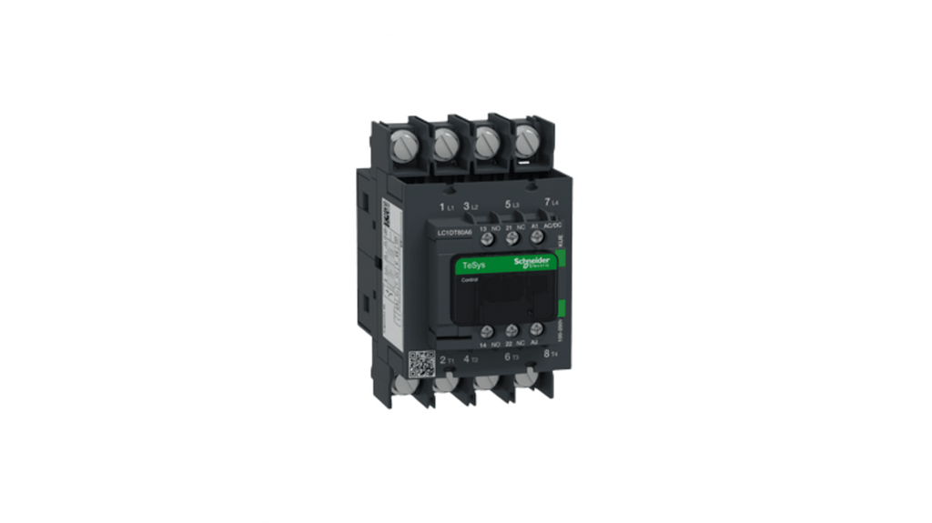 Contattore di commutazione Schneider Electric, serie LC1D, 4 poli, 1 NA + 1 NC, corrente nominale 80 A, tensione bobina 100 a 250 V, montaggio su guida DIN o fissaggio a vite, velocità di funzionamento fino a 3600 cicli all'ora, resistenza al fuoco migliorata, dispositivi ausiliari antipolvere, operante in ambienti fino a 60 gradi Celsius.
