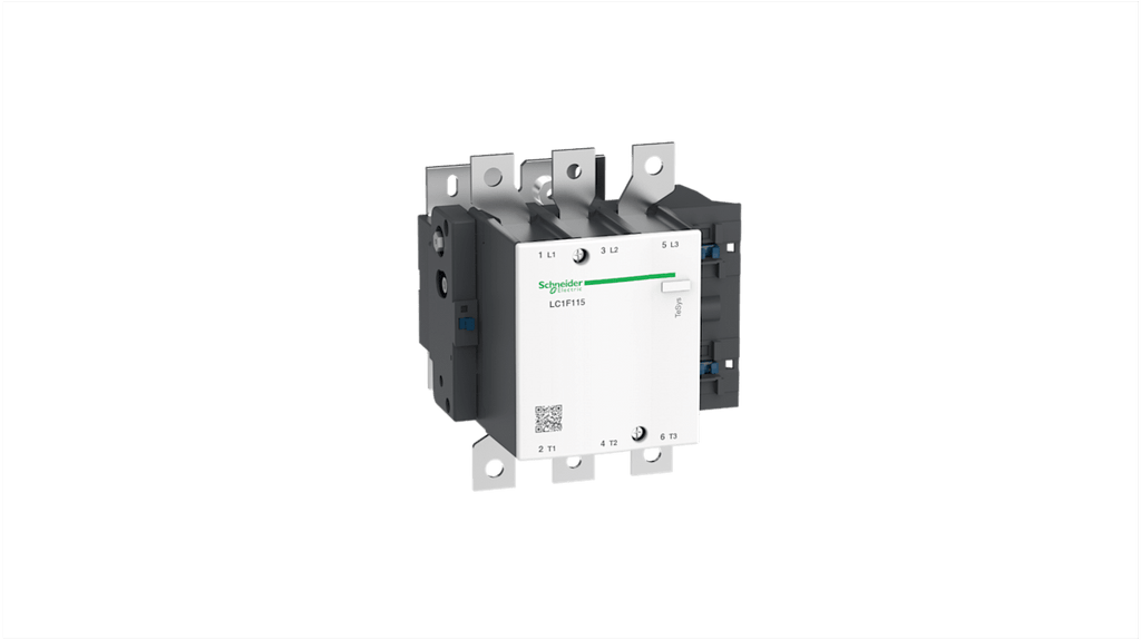Contattore a 3 poli Schneider Electric, serie LC1F, per controllo motori e carico resistivo, corrente nominale 115 A, tensione bobina 440 V c.a., configurazione 3 NO, dimensioni 162 mm x 163.3 mm x 171 mm, temperatura operativa da -5 a +55 gradi Celsius. Codice costruttore LC1F115R7.