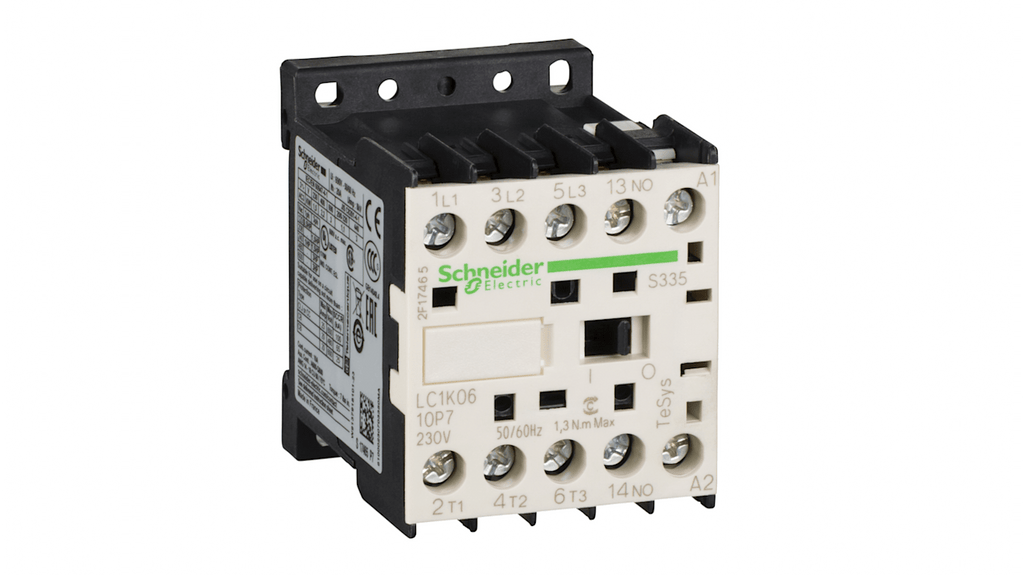 Contattore per controllo motori Schneider Electric, 3 poli, 6 A, 3 kW, bobina 24 V c.a., certificazione IP20, montaggio su guida e piastra, modello TeSys K, configurazione 1 N/A.