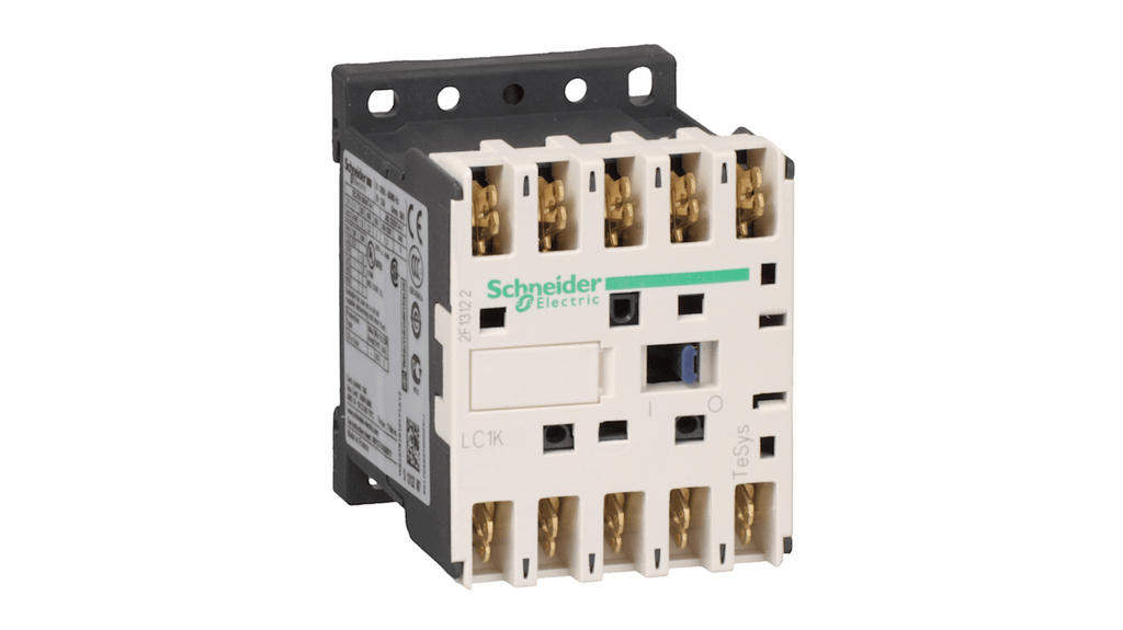 Contattore per motori Schneider Electric, serie LC1K, 4 poli, 2 NO + 2 NC, corrente nominale 20 A, tensione bobina 230 V c.a., tensione nominale contatto 690 V c.a., connettore Faston, dimensioni 45 mm x 58 mm x 57 mm, temperatura operativa da -25°C a +50°C. Codice costruttore LC1K090087P7.