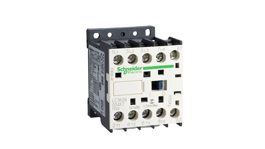 Contattore Schneider Electric, serie LC1K, 3 poli, 2 NO + 2 NC, 9 A, bobina 110 V c.a. Tensione nominale contatto 600 V c.a., tipo terminale vite, larghezza 58 mm, lunghezza 45 mm, profondità 57 mm. Minima temperatura operativa -25°C, massima temperatura operativa +50°C. Conforme a standard CSA, UL, NEMKO, DEMKO, SEMKO, FIMKO, BS5424 Parte 1/IEC 947, VDE 0660, NFC63 110.