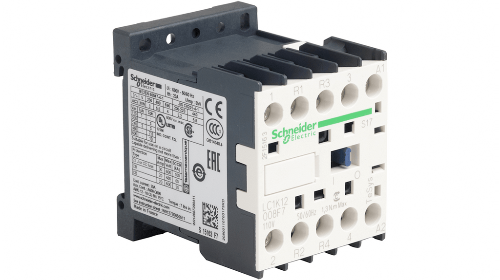 Contattore di commutazione Schneider Electric, serie LC1K, 2 poli, 1 NA + 1 NC, corrente nominale 12 A, tipo aperto, non reversibile, range TeSys K. Codice costruttore LC1K12008F7S17.