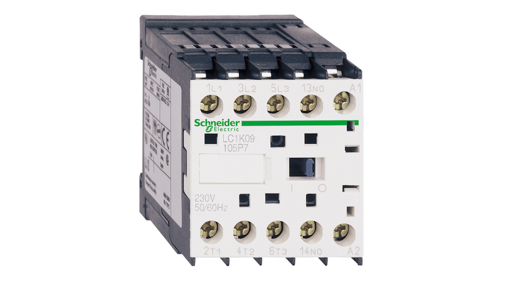Contattore di commutazione Schneider Electric, serie LC1K, 3 poli, 1 NA + 1 NC, corrente nominale 12 A, tensione bobina 24 V. Funzionamento fino a 600 cicli all'ora, temperatura ambiente fino a 60 gradi Celsius. Montaggio su guida DIN o fissaggio a vite, morsetti ad anello, resistenza al fuoco, accessori antipolvere. Design compatto per ottimizzazione dello spazio nell'armadietto.