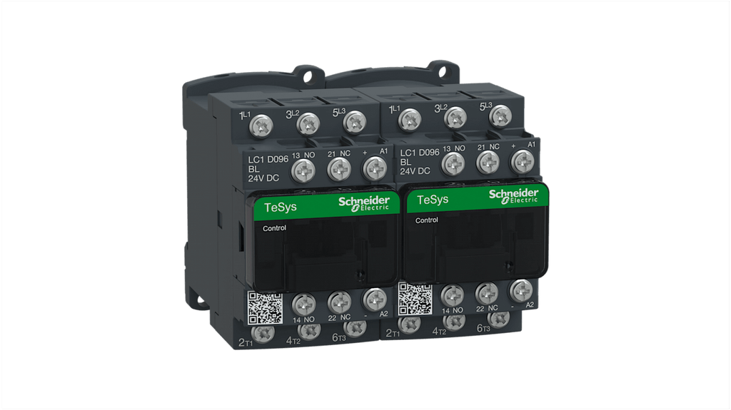 Contattore reversibile per motori, Schneider Electric LC2D096BL, 3 poli, 4 kW, bobina 24 V c.c., corrente nominale 12 A, tensione nominale contatto 300 V c.c. e 690 V c.a., terminazione ad anello ad aletta, dimensioni 77 mm x 90 mm x 95 mm, temperatura operativa da -5°C a +60°C, serie TeSys D.