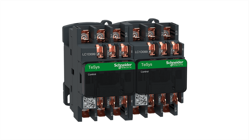 Contattore reversibile per il controllo di motori, 3 poli, 5,5 kW, corrente nominale 9 A, tensione bobina 24 V c.a., contatti 3NO, tensione nominale contatto 300 V c.c. e 690 V c.a., connettore Faston, dimensioni 90 mm x 77 mm x 86 mm, temperatura operativa da -5°C a +60°C, serie TeSys D, codice costruttore LC2D099B7, marchio Schneider Electric.