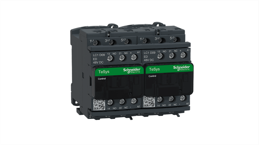 Contattore reversibile per motori, 3 poli, 5,5 kW, corrente nominale 9 A, tensione bobina 48 V c.c., tensione nominale contatto 300 V c.c. e 690 V c.a., serie LC2D, tipo terminale cavo, dimensioni 77 mm x 90 mm x 95 mm, temperatura operativa da -5°C a +60°C.