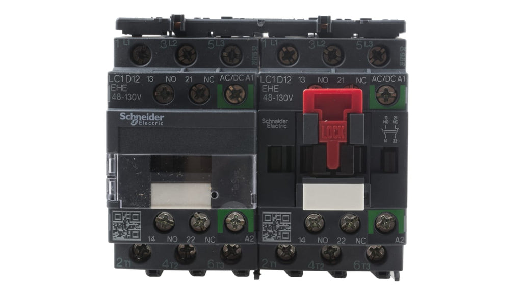 Contattore reversibile TeSys LC2D Schneider Electric, 3 poli, 3 NO, corrente nominale 12 A, potenza nominale 5,5 kW, tensione bobina 110 V c.a./c.c., montaggio su guida DIN, interblocco pre-installato, contatti ausiliari incorporati, terminali a vite, dimensioni 86 mm x 90 mm x 77 mm, temperatura operativa da -25°C a +60°C, conforme agli standard internazionali. Codice costruttore LC2D12EHE.