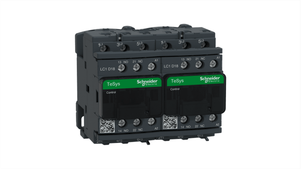 Teleinvertore Reversibile Schneider Electric, serie LC2D, 3 poli, 1 NA + 1 NC, corrente nominale 18 A, tensione bobina 24 V, progettato per applicazioni elettriche domestiche e HVAC, velocità di funzionamento fino a 3600 cicli all'ora, temperatura ambiente fino a 60 gradi Celsius, montaggio su guida DIN o fissaggio a vite, interblocco meccanico, compatto e affidabile.