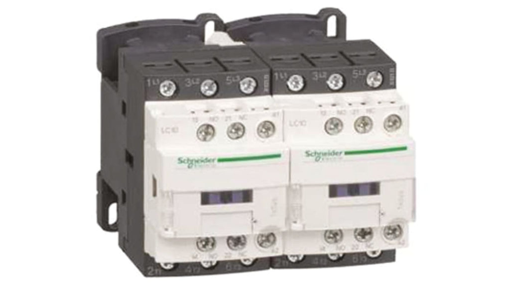 Contattore reversibile per motori, Schneider Electric LC2D18JD, 3 poli, 18 A, potenza nominale 7,5 kW, tensione bobina 12 V c.c., contatti 3NO, tensione nominale contatto 300 V c.c. e 690 V c.a., dimensioni 77 mm x 90 mm x 95 mm, temperatura operativa da -5 a +60 gradi. Serie TeSys D.