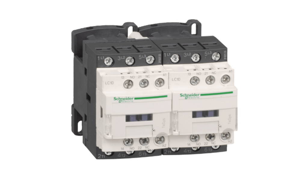 Contattore invertente Schneider Electric TeSys D, 3 poli, 3 contatti normalmente aperti, corrente nominale 25 A, potenza nominale 5,5 kW, tensione bobina 110 V, collegamento mediante morsetti a vite, blocco meccanico, contatti ausiliari 2NO+2NC, compatto (larghezza 90 mm), montaggio su guida DIN o fissaggio a vite, certificazione multi-standard, conformità Green Premium, operatività fino a 3600 cicli/ora, temperatura ambiente fino a 60 gradi.