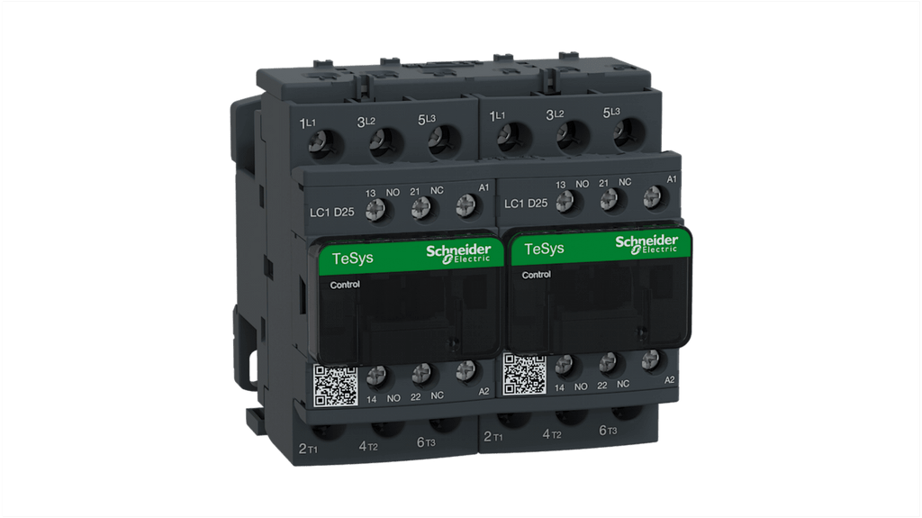 Teleinvertore Reversibile Schneider Electric, serie LC2D, 3 poli, 1 NA + 1 NC, 25 A. Progettato per applicazioni elettriche domestiche e HVAC, operante fino a 3600 cicli all'ora, temperatura ambiente fino a 60 gradi Celsius. Montaggio su guida DIN o fissaggio a vite, interblocco meccanico, compatto e affidabile. Corrente nominale contatto 25 A, configurazione 1 NA + 1 NC.