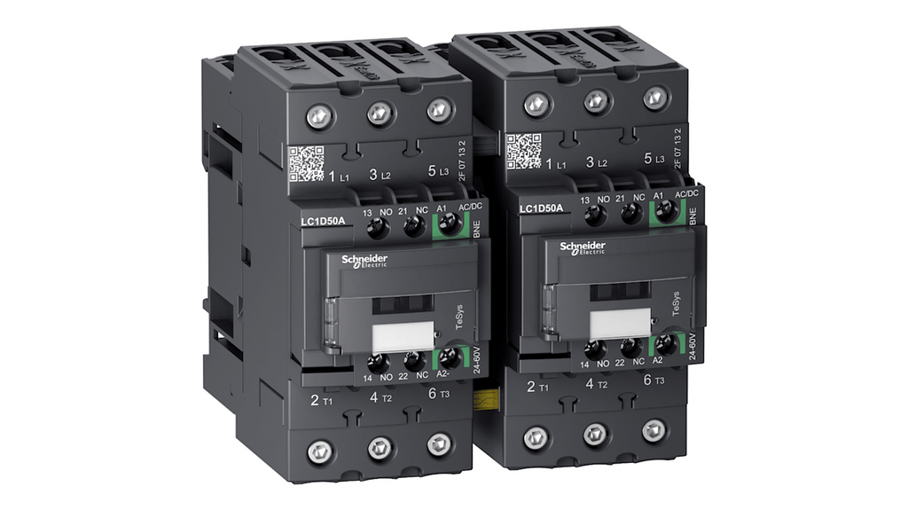 Teleinvertore Reversibile Schneider Electric, serie LC2D, 3 poli, 1 NA + 1 NC, 50 A, bobina 24 V. Tensione bobina 24 V, corrente nominale contatto 50 A, progettato per velocità fino a 3600 cicli/ora, operante in ambienti fino a 60 °C. Montaggio su guida DIN compatta o fissaggio a vite, viti multi-standard per facilitare installazione e funzionamento.