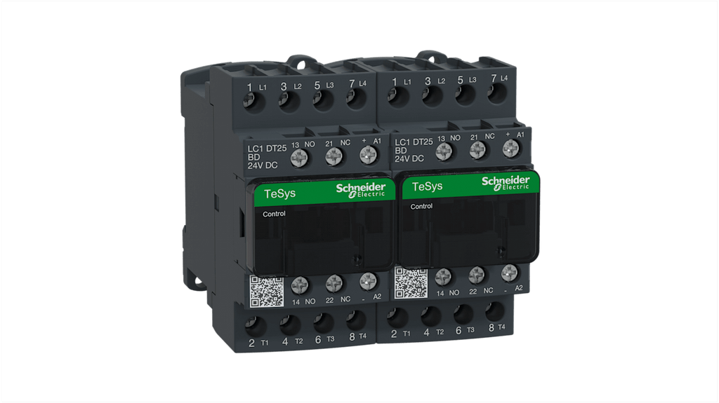 Contattore reversibile per motori, Schneider Electric LC2DT25BD, 4 poli, 4 contatti normalmente aperti, corrente nominale 25 A, tensione bobina 24 V c.c., tensione nominale contatto 300 V c.c. e 690 V c.a., dimensioni 90 mm x 85 mm x 90 mm, temperatura operativa da -5°C a +60°C, serie TeSys D.