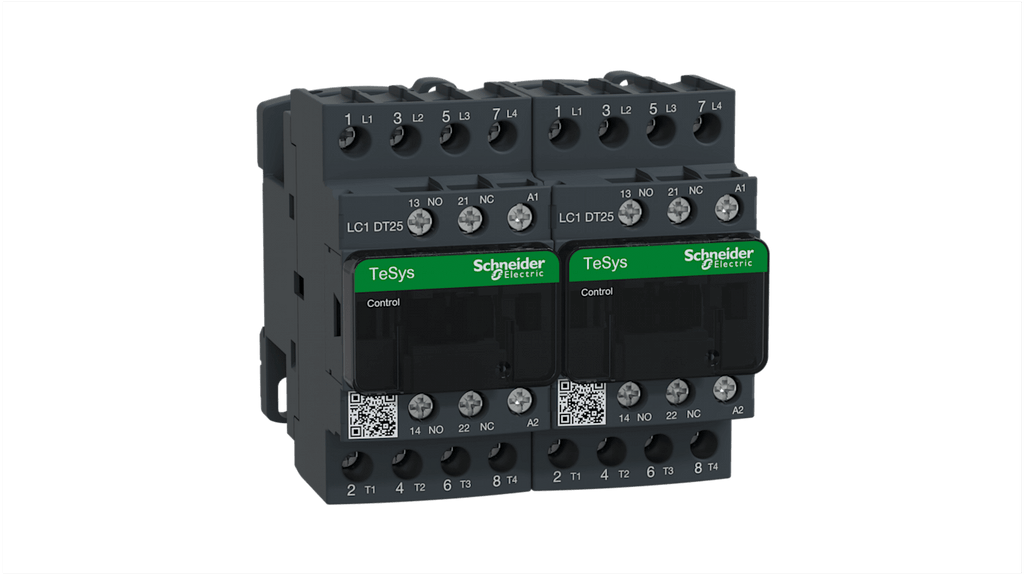 Contattore reversibile per motori, Schneider Electric LC2DT25E7, 4 poli, 4 contatti normalmente aperti, corrente nominale 25 A, tensione bobina 48 V c.a., tensione nominale contatto 300 V c.c. e 690 V c.a., dimensioni 90 mm x 85 mm x 90 mm, temperatura operativa da -5°C a +60°C, serie TeSys D.