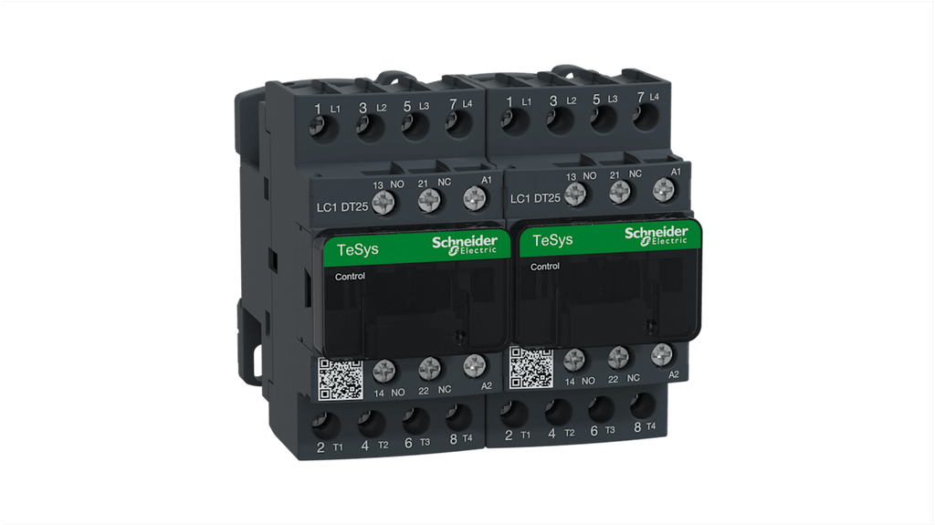 Contattore reversibile quadripolare, 4 poli, 4NO, corrente nominale 25 A, tensione bobina 230 V c.a., tensione nominale contatto 690 V c.a., collegamento con morsetto a vite, 2 contatti ausiliari (1 N/A + 1 N/C), montaggio su guida DIN, dimensioni 90 mm x 85 mm x 90 mm, temperatura operativa da -25°C a +50°C. Marchio Schneider Electric, serie LC2D. Codice costruttore LC2DT25P7.