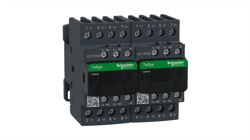 Teleinvertore Reversibile Schneider Electric, 4 poli, 1 NA + 1 NC, corrente nominale 32 A, progettato per applicazioni elettriche domestiche e HVAC, velocità di funzionamento fino a 3600 cicli all'ora, temperatura ambiente fino a 60 gradi, montaggio su guida DIN o fissaggio a vite, interblocco meccanico, compatto, serie LC2D, range TeSys D.