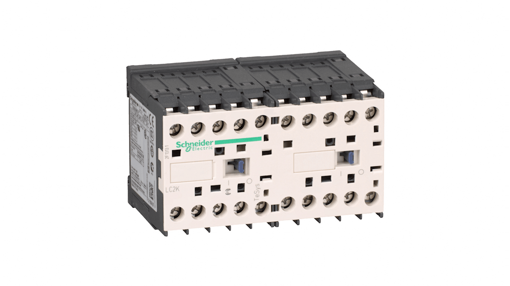 Contattore reversibile per motori, Schneider Electric LC2K06015M7, 3 poli, 3NO, corrente nominale 6 A, potenza 3 kW, tensione bobina 230 V c.a., tensione nominale contatto 690 V c.a., temperatura operativa -25°C a +50°C, dimensioni 90 mm x 58 mm x 57 mm, tipo terminale pin a saldare, configurazione contatti ausiliari 1NC.